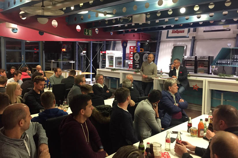 Nachdem in gemütlicher Runde vor dem NLZ die ein oder andere Tasse Glühwein getrunken wurde, schaute der Nikolaus vorbei. Bei dessen Rede kam augenzwinkernd manch Trainer besser, manch Trainer schlechter weg. Vor und nach dem anschließenden Essen im VIP-Bereich des Wildparkstadions beanspruchte Winnie Bartsch mit seinem aktuellen Programm "Dumm gschwätzt isch glei" die Lachmuskeln des NLZ-Teams. In gemütlicher Runde klang der Abend dann noch aus.