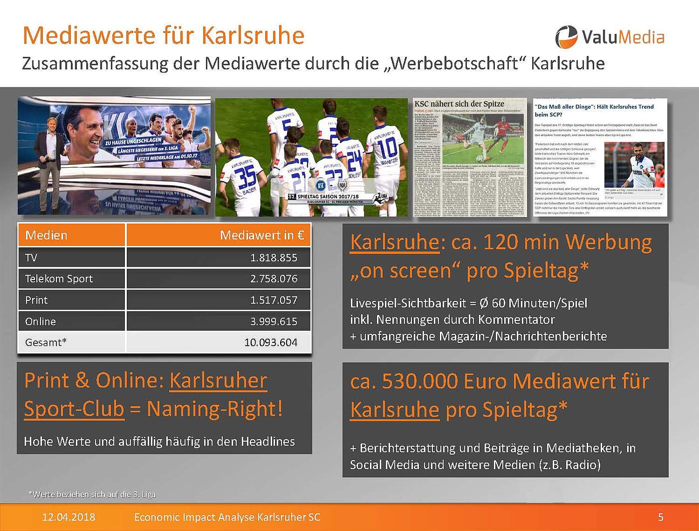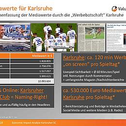 Im zweiten Teil wurden durch eine Medienanalyse in TV, Print- und Onlinemedien die Mediawerte für „Karlsruhe“ ermittelt. Dabei wurden alle redaktionellen Beiträge mit KSC-Beteiligung herangezogen. Nicht berücksichtigt wurden Beiträge im Radio und in den sozialen Medien. Die Mediawerte durch die Werbebotschaft und die Nennung des Wortes Karlsruhe belaufen sich auf rund 10,1 Millionen Euro.