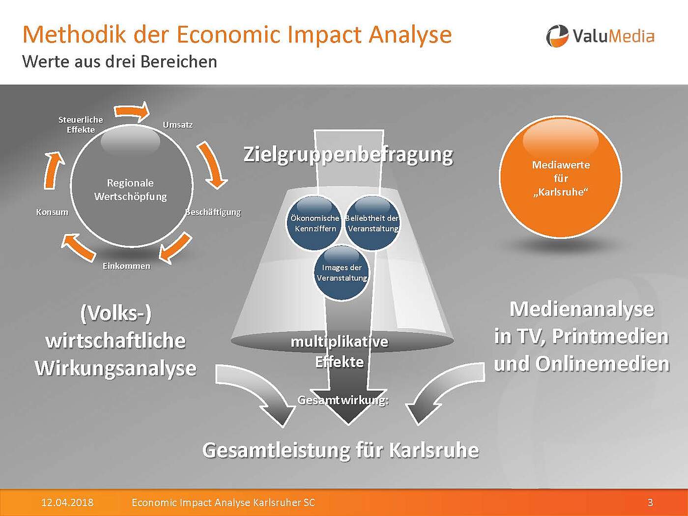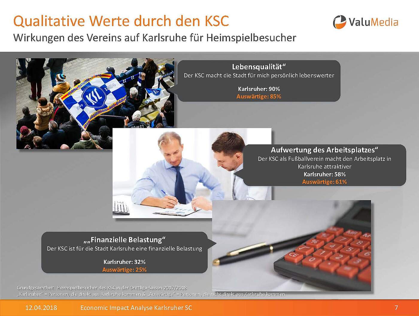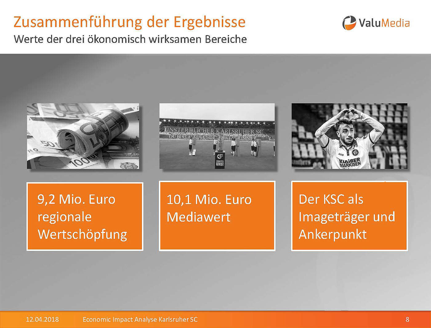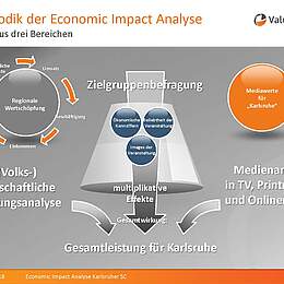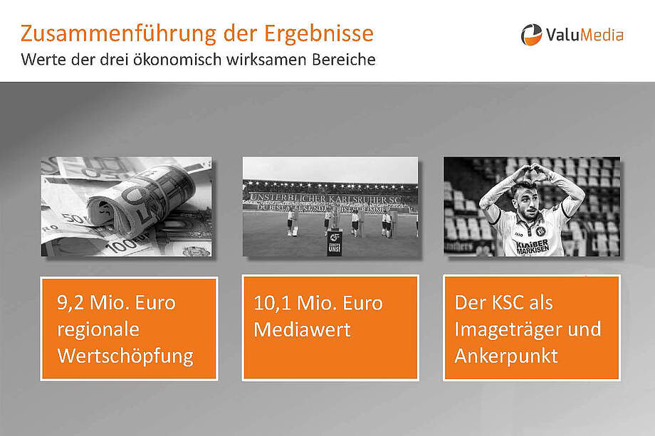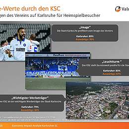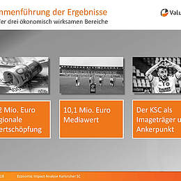 „Die Studie soll zeigen, was der Verein KSC der Stadt und der Region an Wertschöpfung gibt“, sagte Markus Lichti von ValuMedia, die bereits zahlreiche Studien dieser Art für Vereine, Verbände und Vermarkter erstellt hat. Für die Studie wurden Werte aus den drei Bereichen Wertschöpfung durch den KSC, Mediawerte für Karlsruhe und Image-Werte durch den KSC erhoben.