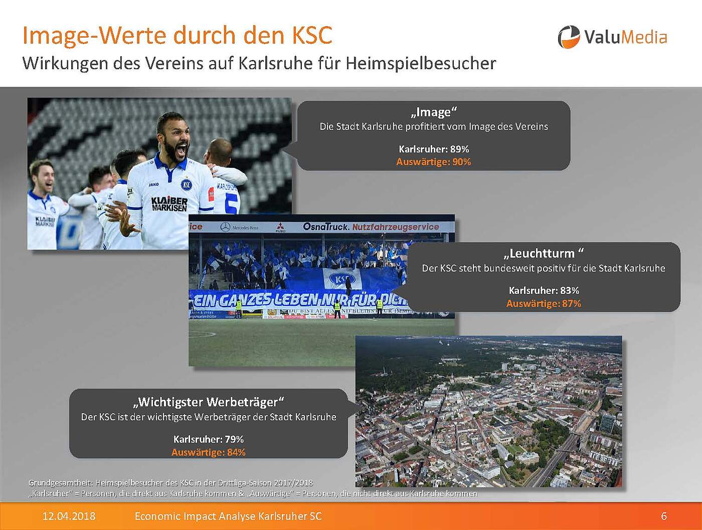 Außerdem wurde eine Zielgruppenbefragung bei Besuchern und Fans des KSC durchgeführt. Der Aussage, dass die Stadt Karlsruhe vom Image des Vereins profitiert, stimmten dabei 89 Prozent der Karlsruher und 90 Prozent der auswärtigen Personen zu. Sehr hohe Zustimmungsraten erhielten auch die Aussagen „Der KSC macht die Stadt für mich persönlich lebenswerter“ (Karlsruher: 90 %, Auswärtige: 85 %), „Der KSC ist der wichtigste Werbeträger der Stadt Karlsruhe“ (Karlsruher: 79 %, Auswärtige: 84 %) und „Der KSC steht bundesweit positiv für die Stadt Karlsruhe (Karlsruher: 83 %, Auswärtige: 87 %).