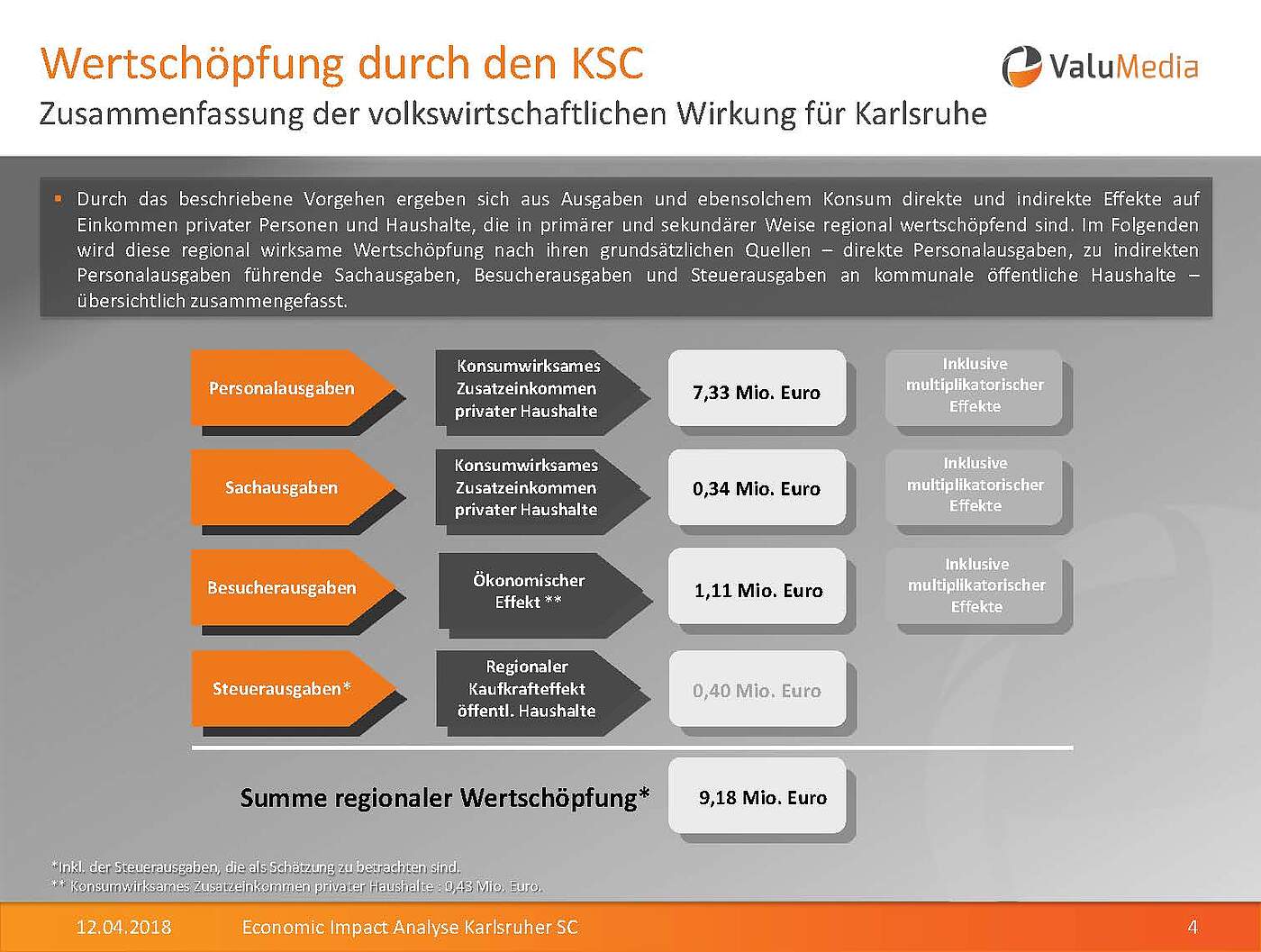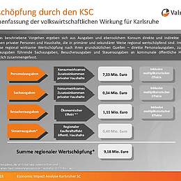 Um die volkswirtschaftliche Wirkung für die Stadt Karlsruhe zu ermitteln, wurden alle Gelder ermittelt, die der KSC, seine Angestellten und die Besucher der Heimspiele in den regionalen Wirtschaftskreislauf einbringen. Die Summe der regionalen Wertschöpfung des KSC für die Stadt Karlsruhe beläuft sich auf insgesamt 9,18 Millionen Euro.