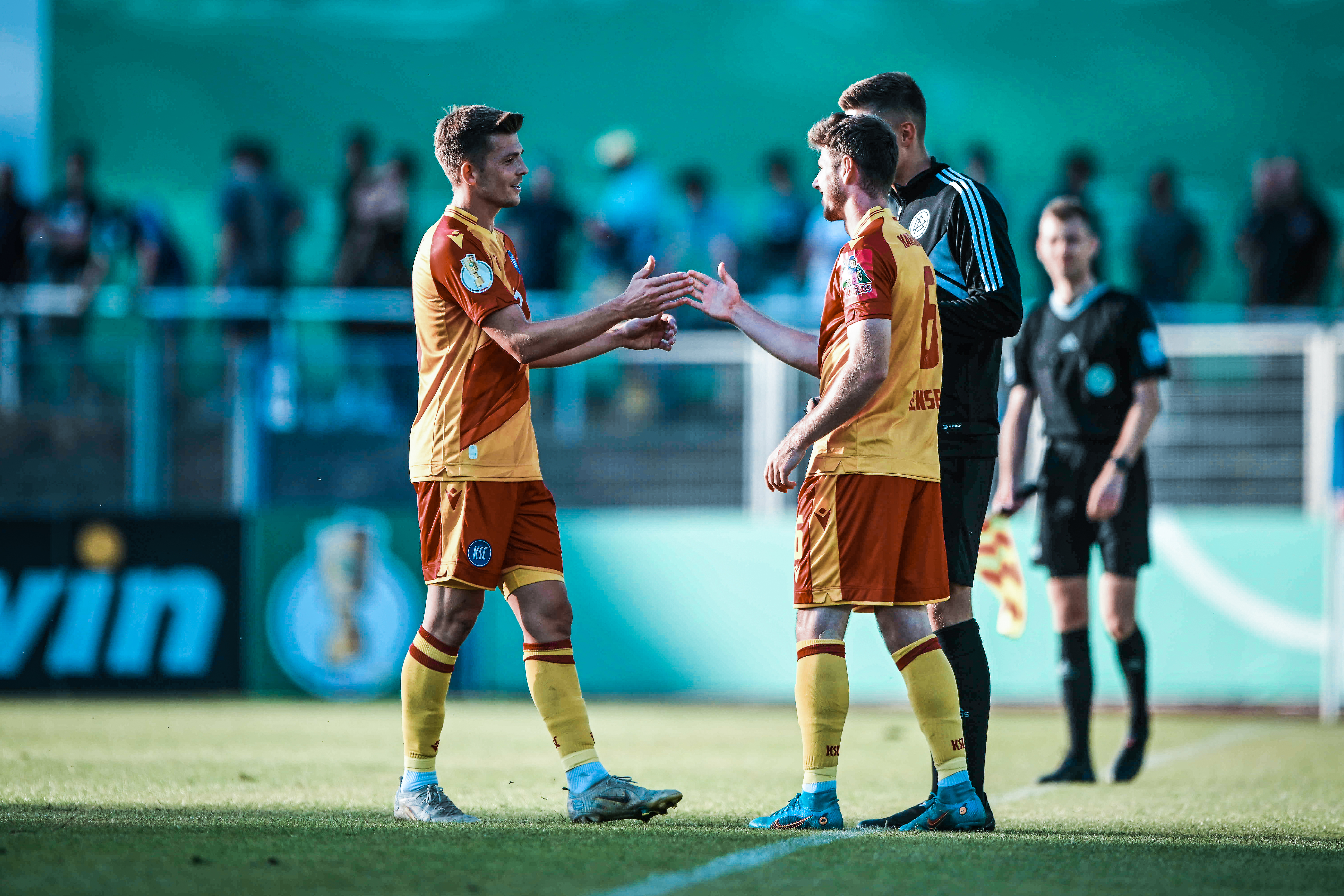 Aufstellung KSC: Weiß – Heise, Franke, Gordon, Thiede – Gondorf (70. Nebel), Breithaupt, Wanitzek (78. Jensen) – Kaufmann (61. Batmaz), Schleusener (61. Rapp), Arase (70. Cueto)