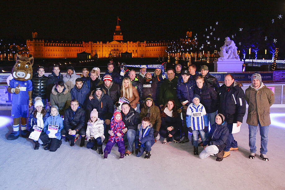 Die Profis des KSC zeigten Dienstagabend neben dem Rasen auch auf dem Eis eine gute Figur. ‘‘Die neue welle‘‘ verloste vorab Plätze für den Wettbewerb unter ihren Zuhörern. Auf der Stadtwerke Eiszeit stellten sich 16 Blau-Weiße beim Eisstockschießen den Teilnehmern bei winterlichen Temperaturen. Vor dem bezaubernd beleuchteten Schloss herrschte nicht nur auf dem Spielfeld, sondern auch bei den Zuschauern rundum und auf der Eisbahn ausgelassene Stimmung. Torhüter Sven Müller war ebenfalls begeistert von der Kulisse: