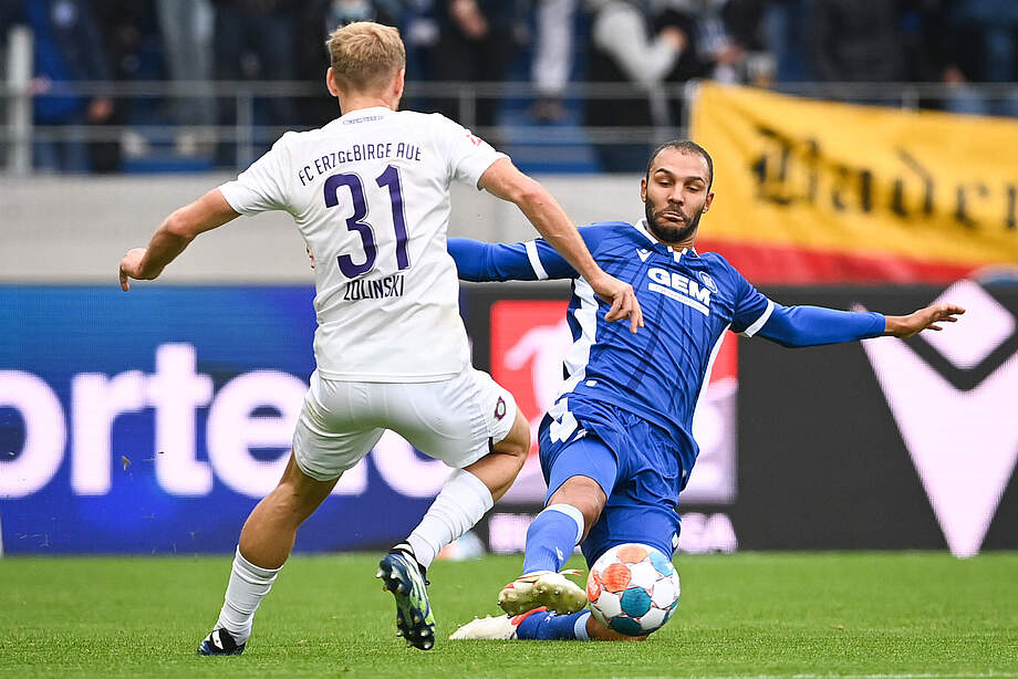 Der Veilchen-Kader ist vielfältig. Zwei Akteure stechen dabei besonders ins Auge: Vereinslegende Martin Männel und Talent Nicolas-Gerrit Kühn. Martin Männel ist seit 2008 nicht nur die unangefochtene Nummer eins, sondern auch das Gesicht der Auer Mannschaft. Bis zum Aufeinandertreffen mit dem KSC hat Männel bereits unfassbare 455 Spiele für Erzgebirge Aue absolviert, 141-mal blieb er ohne Gegentor. Die historischste Partie war für ihn vermutlich das Duell mit dem 1. FC Heidenheim im Mai 2015. In der 88. Minute erzielte der Torhüter nach einer Ecke von Selcuk Alibaz per Kopf den 2:2-Ausgleich. Wenige Wochen später wurde Männel zum Kapitän der Veilchen gewählt. Zuletzt fehlte der 33-Jährige im Auer Tor wegen einer Coronainfektion, im Normalfall ist er aber auch noch nach sieben Jahren Kapitän sowie Ansprechpartner für jüngere Spieler. Einer dieser „jungen“ Akteure ist der 22-jährige Nicolas-Gerrit Kühn. Kühn wurde bei RB Leipzig ausgebildet und machte seine ersten Profispiele zwischen 2018 und 2020 bei Ajax Amsterdam. In dieser Zeit wurde er 2019 mit der goldenen Fritz-Walter-Medaille zum deutschen Nachwuchsspieler des Jahres ausgezeichnet. Aktuell steht Kühn bei der zweiten Mannschaft des FC Bayern unter Vertrag und spielt auf Leihbasis im Erzgebirge. Im bisherigen Saisonverlauf kommt der Offensivspieler auf einen Kicker-Notendurchschnitt von 3,28 und ist damit vor Männel (3,31) der bestbewertete Auer. Zusätzlich ist er mit seinen sechs Torbeteiligungen neben Dimitri Nazarov der Top-Scorer unseres Gegners.