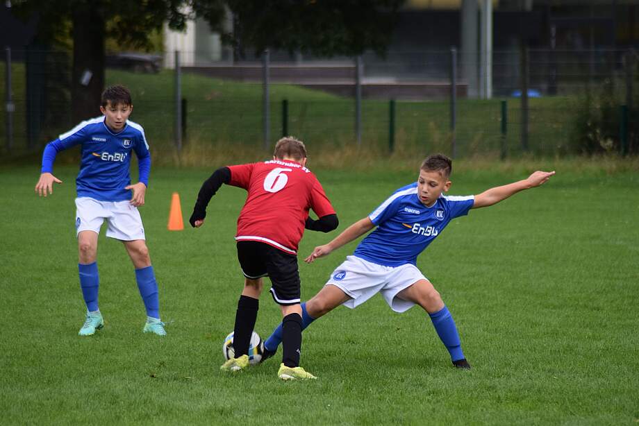Die U12 der KSC GRENKE aKAdemie war zu Gast im Sportpark der U13 des Karlsruher SV. Bei Regen und einem sehr tiefen Platz mit hohem Gras nahmen die Blau-Weißen das Heft direkt zu Beginn in die Hand und drückten den Gegner in die eigene Hälfte. Die Mannschaft um Trainer Aron Jäckle erspielte sich durch gute Kombinationen mehrere Torchancen. Mit einer Führung von 4:0 ging es in die Halbzeitpause. Nach der Pause haben unsere Jungs nicht lockergelassen und dominierten weiterhin das Spiel. Gespielt wurde nur auf ein Tor, wodurch erneut viele Torchancen zu sehen waren. Durch drei weitere, erfolgreiche Torchancen endete das Spiel mit einem verdienten 7:0 Sieg für die Jungs der KSC GRENKE aKAdemie.