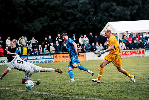Pünktlich zum Anpfiff um 18:30 Uhr legte der Regen in Württemberg eine Pause ein. Diese nutze unser Neuzugang Andrin Hunziker direkt für seinen Debüt-Treffer in Blau-Weiß. Der 21-jährige Angreifer schraubte sich nach einer Ecke in die Luft und köpfte das Kunstleder unhaltbar in die Maschen (7.). Das erste Tor machte Andrin Lust auf mehr, denn nur drei Minuten später erhöhte er auf 2:0, zuvor ließ unser Stürmer einen Innenverteidiger und den Keeper ins Leere laufen (10.). Womöglich vom Viertelfinaleinzug der eidgenössischen Landsmänner beflügelt, setzte unser zweite Schweizer Noah Rupp noch einen obendrauf – 3:0 nach 15 Minuten!