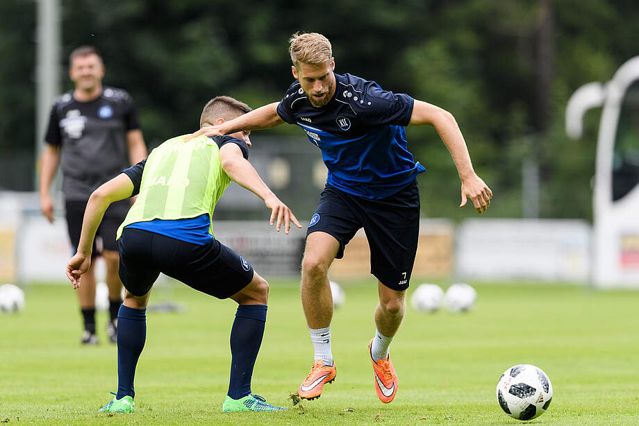 Der zweite Tag im Trainingslager war gezeichnet von besten Bedingungen. Sommerliches Wetter und eine malerische Kulisse in Waidring begleiteten die Mannschaft durch die morgendliche Trainingseinheit. Inhaltlich gestaltete Trainer Alois Schwartz die Einheit locker. Nach Sprint- und Koordinationsübungen rückte schnell der Ball in den Mittelpunkt. In den bisherigen drei Wochen der Vorbereitung im heimischen Karlsruhe stand vor allem Konditions- und Fitnessarbeit im Fokus. Nun verlagert das Trainerteam den Schwerpunkt aufs Spielerische. Torschuss, das Mannschaftsspiel und taktische Spielformen mit und ohne Tor waren somit wesentlicher Bestandteil der ersten Trainingsrunde. Erstmals mit dabei war auch Neuzugang Christoph Kobald, der direkt aus seiner österreichischen Heimat zur Mannschaft stieß.