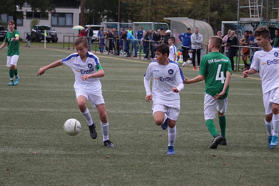 Aller guten Dinge sind drei: Drei Spiele, drei Siege - getreu diesem altbewährten Motto konnte die U13 am vergangenen Samstag die englische Woche mit ihrem dritten Sieg erfolgreich abschließen.Gegen den SVK Beiertheim 2 gelang ein nie gefährdeter souveräner Heimsieg. Was den beiden Trainern dabei besonders gefiel? "Wir profitieren derzeit von einer enormen mannschaftlichen Geschlossenheit. Egal, wer gerade spielt: Eine gute Einstellung und Mentalität ist bei jedem Spieler vorhanden. Gerade, wenn man den großen Altersunterschied zu unserem jeweiligen Gegner bedenkt, ist es umso lobenswerter, mit welcher Vehemenz und Bereitschaft sich unsere Jungs gegen die körperliche Überlegenheit ihrer Kontrahenten stemmen", meinten Yannick Rolf und Marco Hüttlin nach dem Spiel unisono. Zu bemängeln hatten beide Trainer allerdings wie so häufig in dieser Saison ein Defizit in Sachen Chancenverwertung. Denn bei genauer Betrachtung hätten es gut und gerne fünf bis sechs anstatt der erzielten drei Treffer sein können und das Ergebnis wäre noch klarer gewesen. So zum Beispiel bereits nach sechs Spielminuten, als ein KSC-Akteur nach einem Vertikalpass aus dem Mittelfeld auf und davon zog, letztendlich aber an der Fußabwehr des gegnerischen Schlussmanns scheiterte. Erneut auf dem Posten zeigte sich der gute Gästetorwart nach einer guten viertel Stunde, als er einen Ball nach dem bis dato schönsten Angriff der Heimelf entschärfte. Vorausgegangen war ein "doppelter Doppelpass" und perfekt getimter Steilpass in die Tiefe, welcher aber wie erwähnt entscheidend vom Beiertheimer Schlussmann entschärft wurde. Machtlos war er dann aber nur eine Zeigerumdrehung später: Dynamischer Antritt auf Höhe der Mittellinie, zwei bis drei Gegenspieler hoffnungslos überrannt und dann ein unhaltbarer Schuss hinein ins Beiertheimer Netz: 1:0 für den KSC nach einer wirklich sehenswerten Einzelleistung.Nichtminder hochwertig war das 2:0.Unmittelbar nach seiner eigenen Balleroberung umkurvte ein KSC-Akteur seine Gegenspieler im temporeichen Slalom-Dribbling und zirkelte den Ball geschickt am herauseilenden Torhüter vorbei ins linke untere Toreck.Und die Gäste? Die hatten ihren spielerischen Höhepunkt dann in Minute 31, als ihr bis dato gefährlichster Angriff beinahe zum Anschlusstreffer geführt hätte. Nach einem schönen Schnittstellenpass steuerte der Angreifer der Gäste direkt das KSC-Gehäuse an, scheiterte mit seinem Flachschuss allerdings am Innenpfosten. Der Abpraller wurde dann zur sicheren Beute des aufmerksamen KSC-Keepers. Nach dem Seitenwechsel sorgte die Heimelf mit dem 3:0 dann zügig für Ergebnissicherheit. Nachdem ein KSC-Spieler der gesamten Beiertheimer Hintermannschaft davonsprintete und zunächst am gegnerischen Torwart scheiterte, bugsierte sein lauernder Teamkollege den abprallenden Ball geschickt ins entblößte Tor der Gäste. An diesererfolgreichen Co-Produktion war ebenso ein gerade eingewechselter Spieler beteiligt wie beim krachenden Schlussakkord, als gar zwei neu aufs Feld gekommene KSC-Spieler glänzend miteinander harmonierten: Nach klugem Vertikalpass knallte der satte Torschuss des Mannschaftskollegen allerdings humorlos und lautstark ans Aluminium. Was die Trainer in ihrer eingangs getätigten Aussage bestätigt. Gut zu wissen, dass in diesen kräftezehrenden Wochen die "Vitamin-Zufuhr" von der Bank bestens funktioniert. "Es ist außerdem toll zu sehen, dass auch die jeweils nicht nominierten Spieler bei den Spielen anwesend sind und so ihre Verbundenheit zeigen", lobten beide Trainer zudem den tollen Teamgeist ihrer Mannschaft.