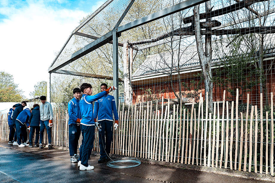 Auch beim Gehege der Leoparden, nicht unweit entfernt von den Affen, gab es etwas für unsere Jungs zu tun. Ein neuer Zaun sollte die Umgebung schmücken. Aus dünnen Holzlatten und Draht meisterte die U16 in Teamarbeit auch diese Aufgabe. Im Anschluss gab es eine wohlverdiente Mittagspause.