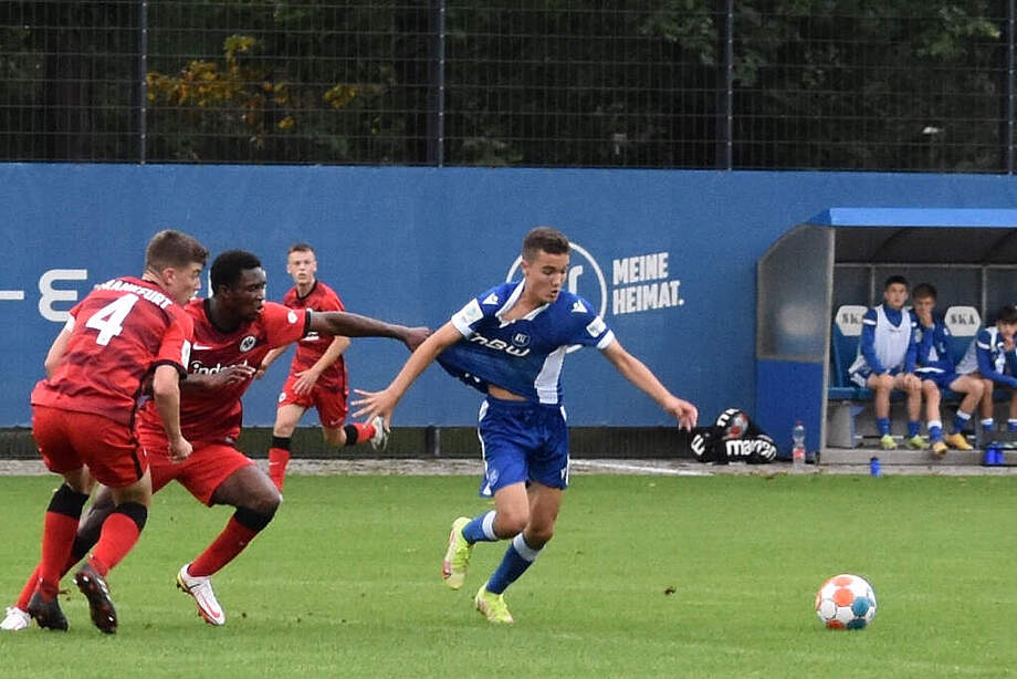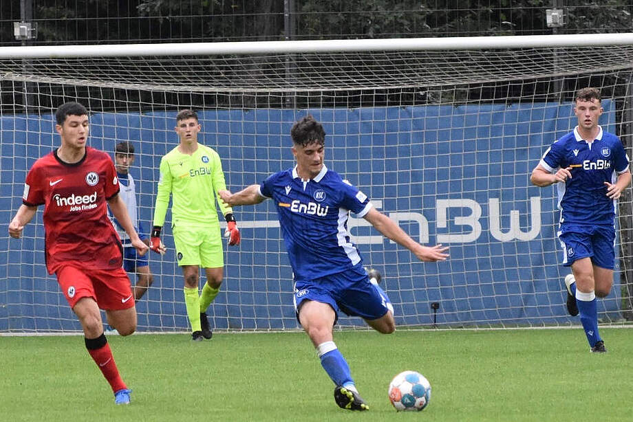 Im vierten Spiel dieser Saison erkämpfte sich unsere U17 am Mittwochabend einen weiteren Punkt. Beim Unentschieden gegen die Eintracht Frankfurt im heimischen GRENKE-Jugendstadion hätten durchaus mehr Tore für unsere Blau-Weißen fallen können.