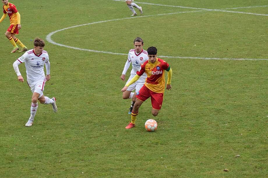 Nach Anpfiff entwickelte sich bereits früh ein hitziges und kampfbetontes Spiel von beiden Seiten. In der ersten halben Stunde konnten beide Teams Chancen für sich verzeichnen. Eine große Chance kam in der 34. Minuten für unsere Gegner zustande, als der Schiedsrichter nach dem Foul von Moreno im Strafraum gegen den Nürnberger Kapitän Fuchs, auf den Elfmeterpunkt zeigte. Diesen konnte der KSC GRENKE aKAdemie Torhüter Leon Pertl in seinem ersten Saisonspiel parieren. Kurz vor der Pause erzielte Majid Mohammadi für uns das 1:0. So ging es in die Halbzeit. In den zweiten 45 Minuten schmissen wir alles rein, um den Sieg über die Zeit zu bringen. Leider konnte Nürnberg in der 76. Minute nach einer Ecke ausgleichen.